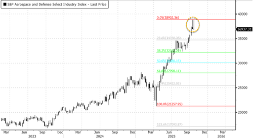 The S&P 500 Aerospace & Defense Index (SPSIAD Index) has surged as much as 72% since late March, fueled by rising defense spending and the U.S. military’s strategic reposturing under what we’ve dubbed the “Western Hemispheric Defense” theme. But after weeks of hitting technical resistance, and with growing risks of a near-term pullback, attention now turns to insights from Goldman analysts, who met this week with 15 defense firms at the AUSA conference to gauge what 2026 might bring for the sector.