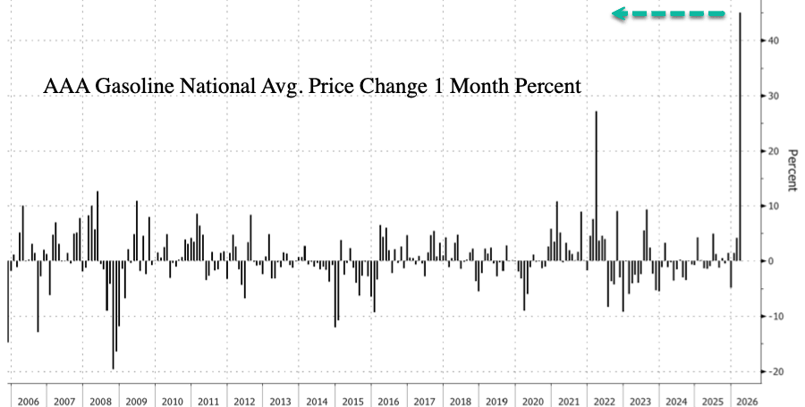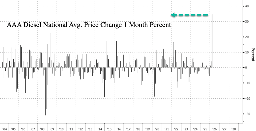 Furthermore, AAA data shows the national average diesel price has surged 45% this month to $5.45 per gallon. That marks the largest spike on record.