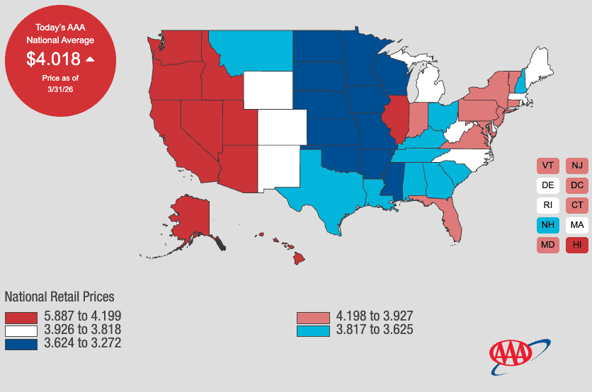 The latest AAA data shows gasoline prices nationwide topped $4 a gallon on Monday, a 35% increase for Regular 87 at the pump and the largest price shock on record dating back to 2004.