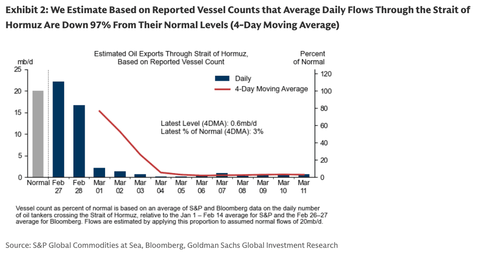 Focusing on the Strait of Hormuz chokepoint, data from UBS and Goldman desks show that flows through the critical waterway remain muted by the end of the week.