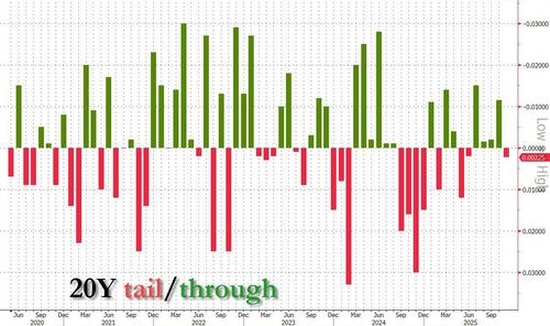 In this week’s lone coupon auction, which just happens to print an hour before the release of the October FOMC minutes, moments ago the US sold $16BN in 20Y bonds at a high yield of 4.706%, up 20bps from 4.507% last month and the highest since August. The auction also tailed the When Issued 4.704% by 0.2bps, the first tail since June.