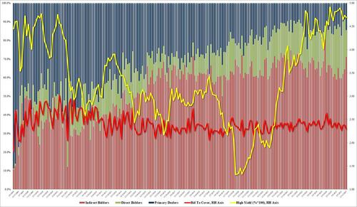 Overall, this was another subpar, tailing auction, and the only saving grace was the rebound in foreign buyers. Yet judging by the move higher in yields across the curve, the market was clearly disappointed with today’s auction.
