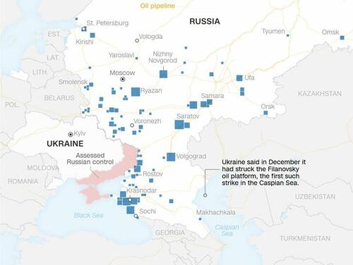 Ukraine revealed Thursday its long-range drones targeted and hit major offshore oil platform in the Caspian Sea. The offshore oil field run by Lukoil had to effectively halt production, according to Oil Price. It is said to be the single biggest oil field in the Russian sector of the Caspian.