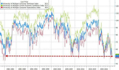 The headline sentiment printed at a stunning 50.3, well below the 53.0 expected and down from 53.6 ion October with both Current Conditions (52.3 from 58.6) and Expectations (49.0 from 50.3).