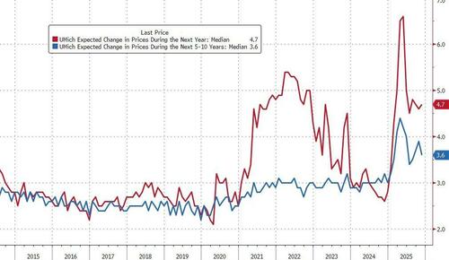 Long-run inflation expectations declined from 3.9% last month to 3.6% in November. Year-ahead inflation expectations inched up from 4.6% last month to 4.7% this month and remained well below readings in May in the wake of the initial announcements of major tariff changes.
