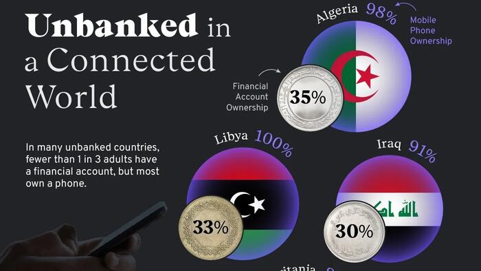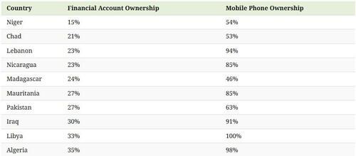 For the most unbanked countries worldwide, here are the percentages of adults who own a financial account and those who own a mobile phone.