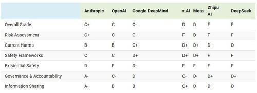 The table below shows the overall grade of each AI company in terms of safety, along with their grades in specific safety categories.