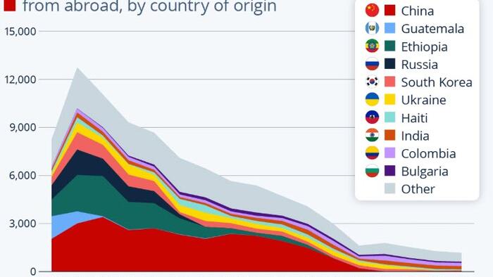 In the last two and a half decades, more children from China have been coming to the U.S. as adoptees. Between 1999 and 2023, they numbered almost 83,000 compared with 46,000 from Russia, 30,000 from Guatemala, 21,500 adoptees from South Korea, 16,000 from Ethiopia and 12,000 from Ukraine. China stopped international adoptions during the pandemic, resuming the practice again in 2023, when 16 children were adopted in the U.S. This figure is expected to remain low, however, following an announcement from Beijing that the country will no longer be facilitating intercountry adoptions unless to blood relatives. The move takes place in a country experiencing a shrinking and aging population with a falling birth rate. Last fiscal year, a total of 24 children were adopted from China. Meanwhile, 74 children were adopted from Taiwan, which is the fourth highest number in 2024, trailing only after India (202), Colombia (200) and Bulgaria (79).