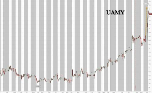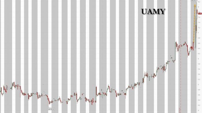 After MP Materials, Intel and Centrus Energy, the latest domino in the US industrial economy game has just been revealed: this morning shares of US Antimony (UAMY) soared 20% after the company announced that it has secured a sole-source, five-year contract worth up to $245 million from the U.S. Defense Logistics Agency to supply antimony metal ingots for the national defense stockpile. With the company’s entire market cap just over $800 million, one can see why this contract is a huge boost to the company’s prospects… and stock price.