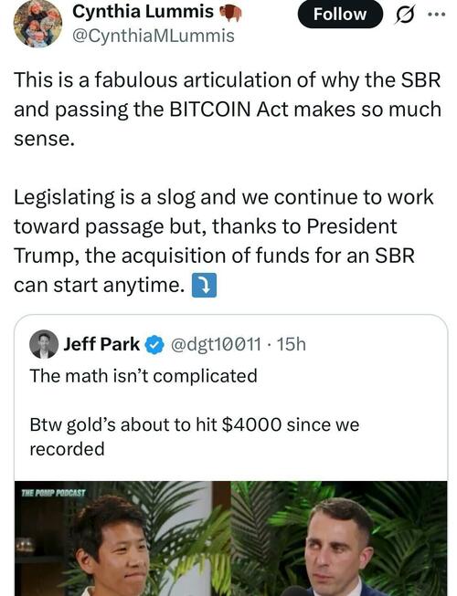 In an X post on Monday, Lummis said that while it remains a “slog” on the legislative side of things, thanks to “President Trump, the acquisition of funds for an SBR can start anytime.”