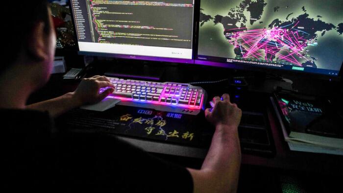 A member of the hacking group Red Hacker Alliance using a website that monitors global cyberattacks on his computer in Dongguan, Guangdong Province, China, on Aug. 4, 2020. Nicolas Asfouri/AFP via Getty Images