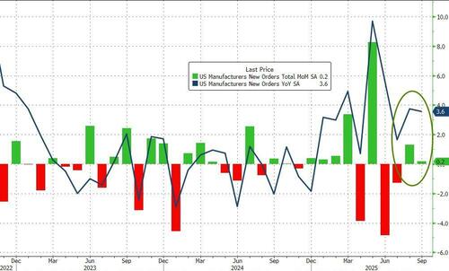 US Factory Orders disappointed, rising just 0.2% MoM (+0.3% exp) and slowing notably from the +1.3% MoM jump in August (and up 3.6% YoY)…