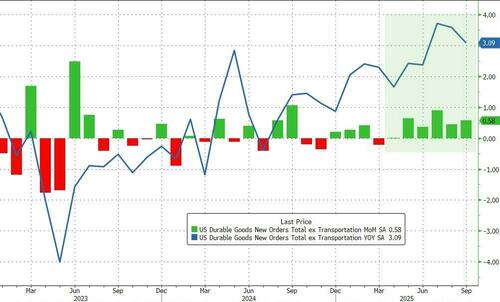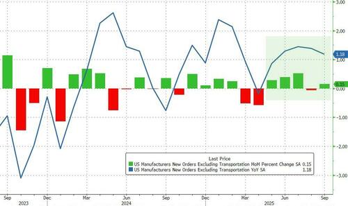 Core Factory Orders (ex-Transports) also rose 0.2% MoM, up notably from the downwardly revised 0.1% MoM decline in August (but remains up over 1% YoY)…