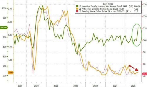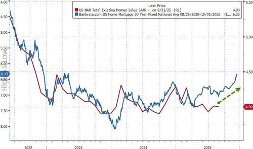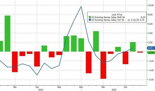 Following yesterday’s surge in new home sales (thanks to a huge wave of incentives from homebuilders), existing home sales brought us back to earth with a 0.2% MoM decline (better than the 1.4% MoM drop expected)
