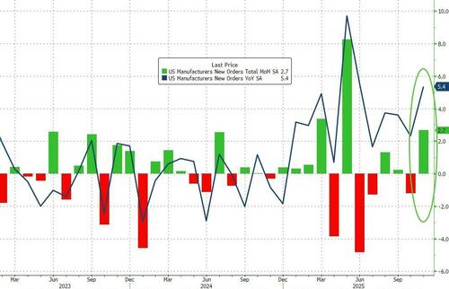 This morning we get a fresh glimpse at America’s manufacturing segment – hard data – with US Factory Orders (admittedly for November) surging 2.7% MoM (significantly better than the +1.6% MoM expected), bouncing strongly from the 1.3% MoM decline in October.