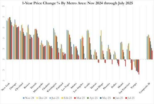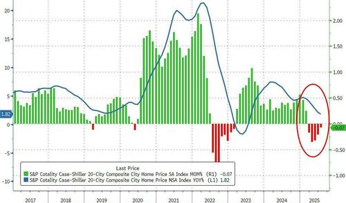 Home prices across the top 20 cities in the US fell by 0.07% MoM (less than the 0.2% decline expected) – the fifth straight monthly drop in prices. This pulled the YoY price appreciation down to 1.82%, the lowest since July 2023…