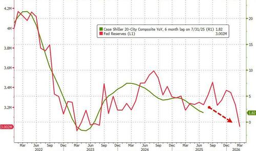But, home price changes do seem to track very closely with bank reserves at The Fed (6mo lag), which implies home prices could rapidly decelerate in the new year (after a brief rebound)…