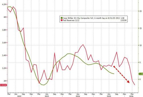 However, home-price changes do seem to track very closely with bank reserves at The Fed (6mo lag)…