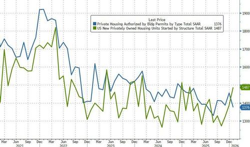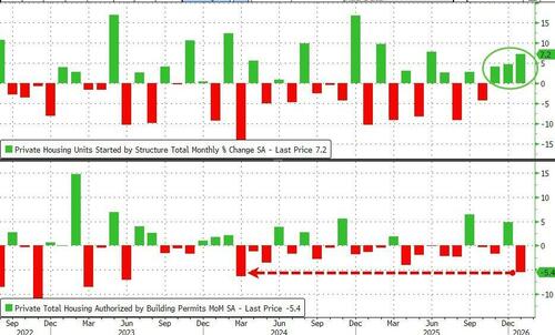 Starts rose 7.2k in preliminary January data (far greater than the 4.5% MoM decline expected while Permits plunged 5.4% MoM (worse than the 3.1% decline expected)…