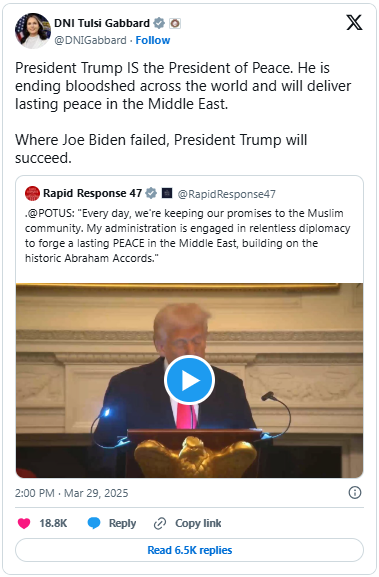 Earlier this year the president’s intelligence chief Tulsi Gabbard made a similar social media post, tweeting that “President Trump IS the President of Peace. He is ending bloodshed across the world and will deliver lasting peace in the Middle East.”