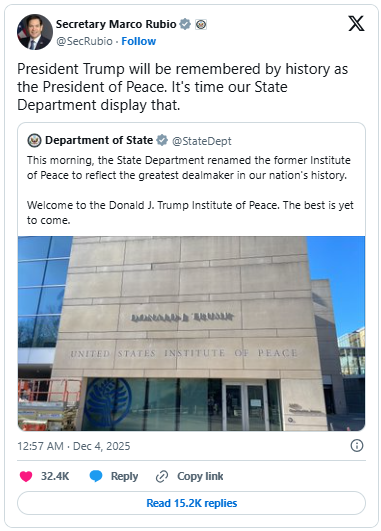 The US State Department has renamed the US Institute of Peace the Donald J Trump Institute of Peace, proclaiming that it did so “to reflect the greatest dealmaker in our nation’s history.”