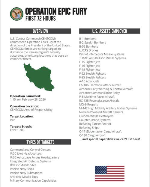 In the first 72 hours of Operation Epic Fury, U.S. forces conducted more than 1,700 strikes across Iran on high-value IRGC military assets and leadership. These strikes relied heavily on air-delivered munitions, including bombs, air-launched rockets, and missiles deployed from stealth fighter jets, stealth bombers, fourth-generation fighter jets and bombers, as well as guided-missile destroyers.