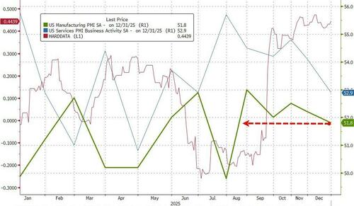 …and this morning brings more weakness as S&P Global’s US Manufacturing PMI (final print for December) dipped to 51.8 – its lowest since July (the only contractionary – sub-50- month of 2025)…