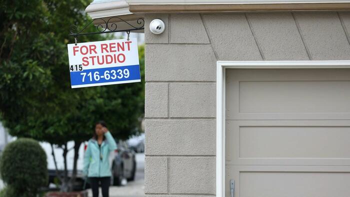 A sign is posted in front of an apartment building with available rentals in San Francisco on June 9, 2023. Justin Sullivan/Getty Images