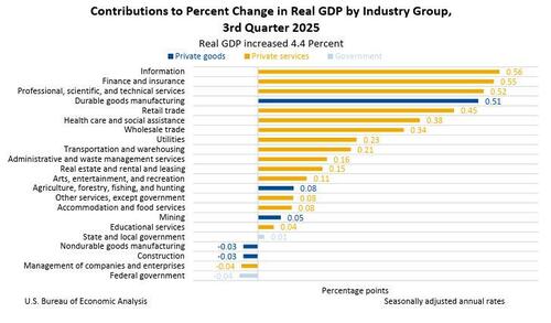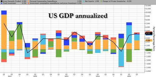 While it’s ancient history now – even preceding the record long government shutdown – and nobody will care, moments ago the BEA reported that its first revision of third quarter GDP came in a bit hotter than expected as US GDP grew slightly more than initially reported, supported by stronger exports. Due to the recent government shutdown, this updated report for the third quarter of 2025 replaces the release of the third estimate originally scheduled for December 19, 2025, the BEA reported.