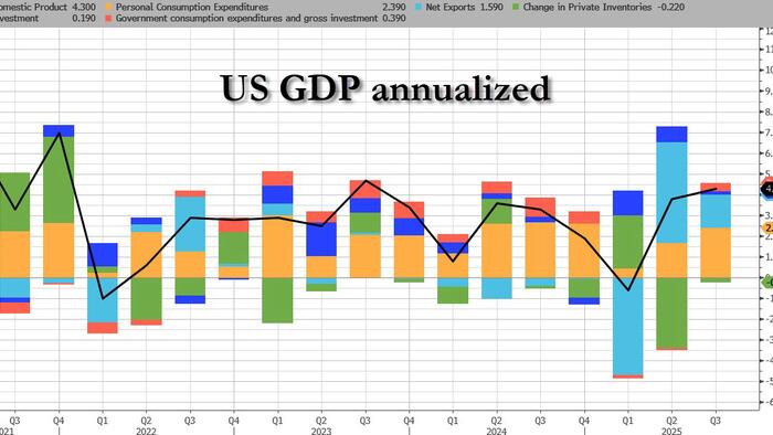 While it’s ancient history now – even preceding the record long government shutdown – and nobody will care, moments ago the BEA reported that its first revision of third quarter GDP came in a bit hotter than expected as US GDP grew slightly more than initially reported, supported by stronger exports. Due to the recent government shutdown, this updated report for the third quarter of 2025 replaces the release of the third estimate originally scheduled for December 19, 2025, the BEA reported.