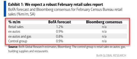 Bank of America’s omniscient analysts forecast a very strong month for Retail Sales in February data (released today)…