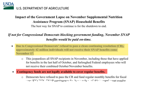 Due to Congressional Democrats’ refusal to pass a clean continuing resolution (CR), approximately 42 million individuals will not receive their SNAP benefits come November 1