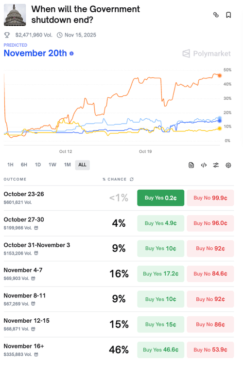 The federal government shutdown entered Day 25 on Saturday, with cryptocurrency-based prediction market Polymarket showing odds in the single digits that Democrats and Republicans will reach a resolution before November 3. The market currently assigns a 15% probability that the shutdown will end between November 12 and 15.