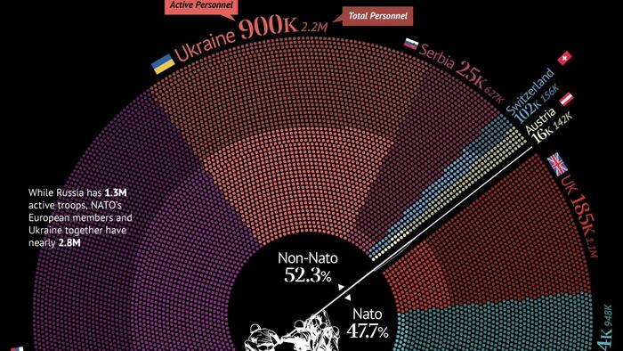 This visualization, via Visual Capitalist’s Bruno Venditti, breaks down the estimated size of military forces across Europe in 2025. It covers both active personnel and total military strength, which includes reserves and paramilitary units. The data for this visualization comes from GlobalFirepower. Countries are also categorized by NATO membership.