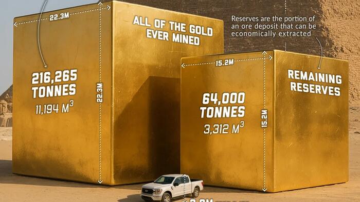 If all the gold ever mined were melted together—about 216,000 tonnes—it would form a cube only 22 meters tall, roughly the height of a four-story building.