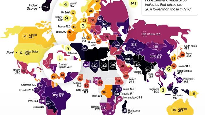If a country has a value of 80, for example, it indicates that prices are 20% lower than they are in New York City.
