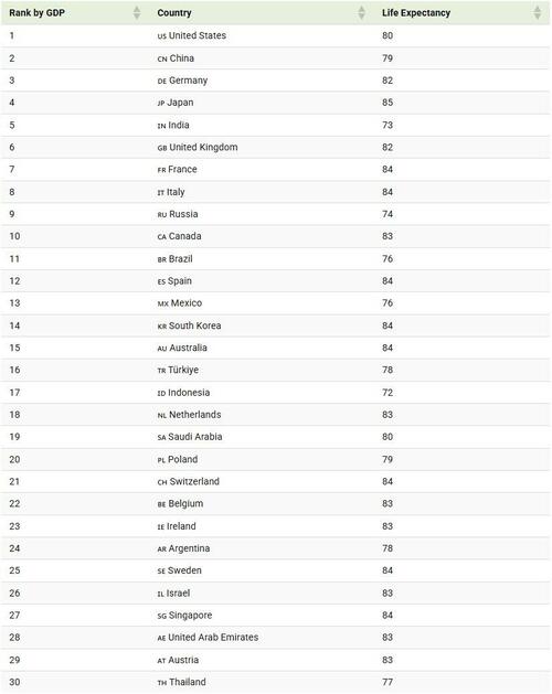 Below, we rank countries based on GDP in 2025, including their life expectancies at birth: