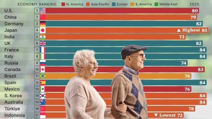 This graphic, via Visual Capitalist’s Dorothy Neufeld, shows life expectancy by country across the world’s 30 largest economies, based on data from the United Nations.