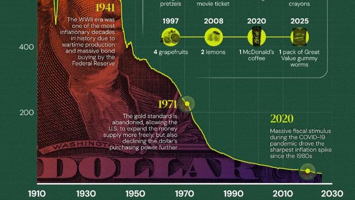 In this graphic, Visual Capitalist’s Marcus Lu tracks the decline in the purchasing power of the U.S. dollar since the early 1900s, illustrating how inflation has eroded its value.