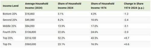 On the other hand, the top 5% of earners, averaging $560,000 in income has seen it share expand by 6.6 percentage points. Moreover, it is the only income bracket, along with the top 20%, to see its share of national income grow compared to 1974.
