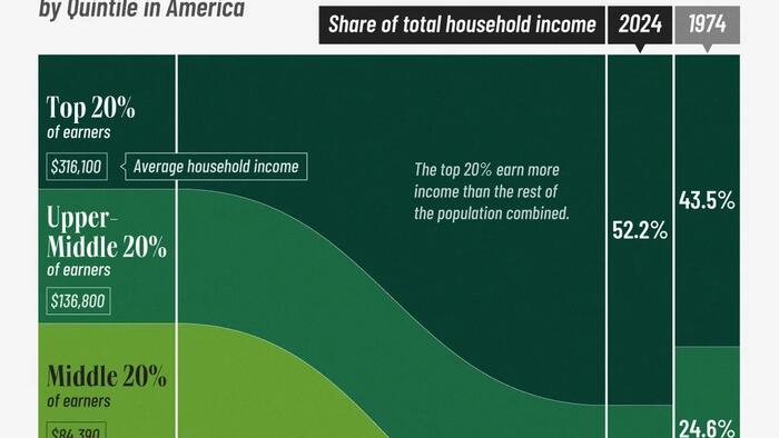 In 2024, the top 20% – with an average household income of $316,100 – took home 52.2% of all national income, up 8.7 percentage points from 1974.