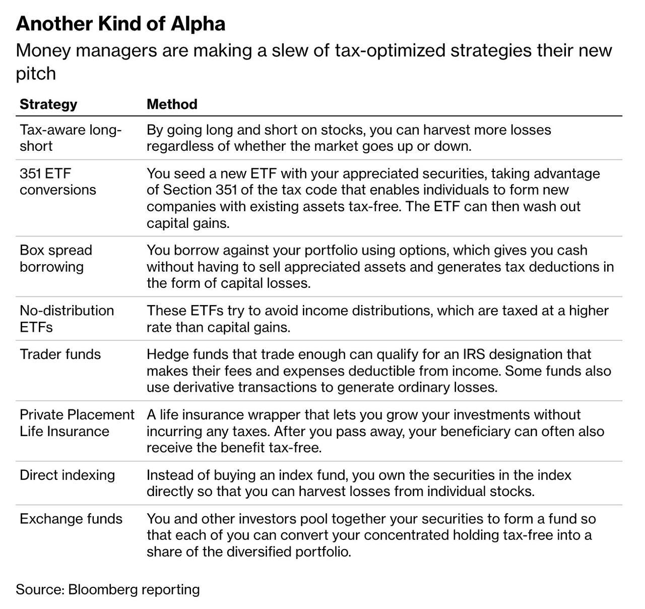 Tax alpha — the practice of improving investment returns by reducing taxes — has become one of the fastest-growing strategies on Wall Street, according to Bloomberg.