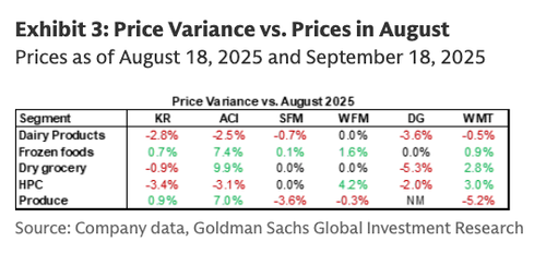 The latest September grocery pricing survey from Goldman Sachs analysts shows that Walmart remains the leader in the price war among retailers, including Kroger, Albertsons, Sprouts Farmers Market, Whole Foods (WFM), and Dollar General.