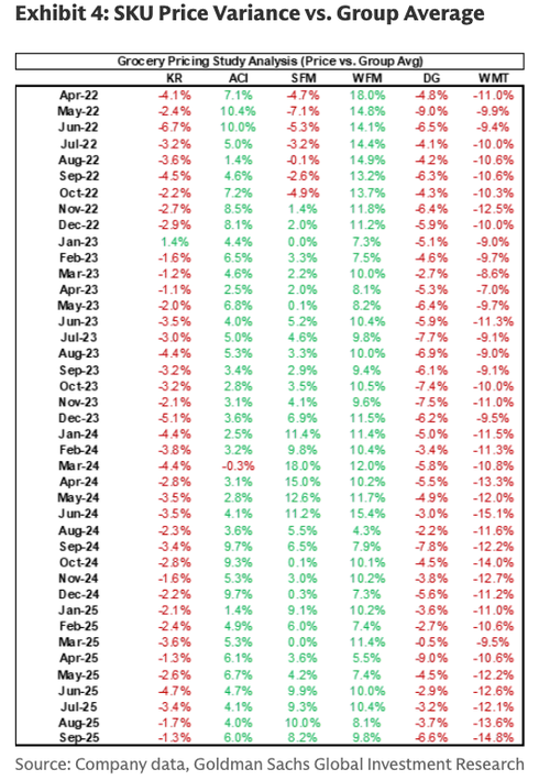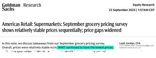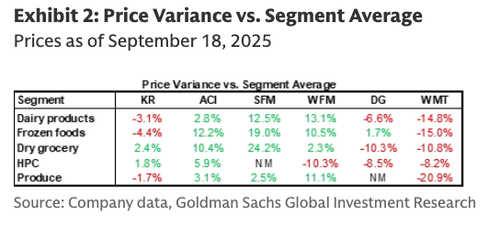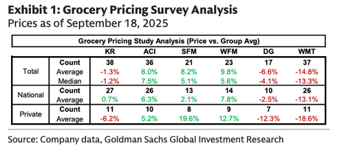A team of Goldman analysts led by Leah Jordan wrote in a note to clients on Monday their key takeaways from the September grocery pricing survey. The survey reveals that overall, month-over-month pricing among tracked retailers remains stable, with Walmart continuing to offer the lowest prices, despite price gaps widening.