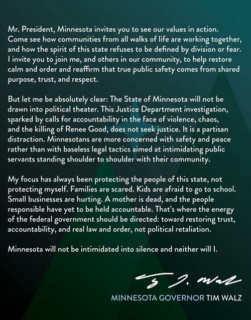 Gov. Walz released the following statement on social media, calling the DOJ investigation a “partisan distraction.”