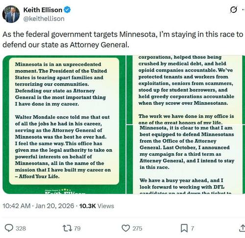 Keith Ellison on Tuesday released a statement declaring his intention of staying in the race for Minnesota’s attorney general “as the federal government targets Minnesota.”