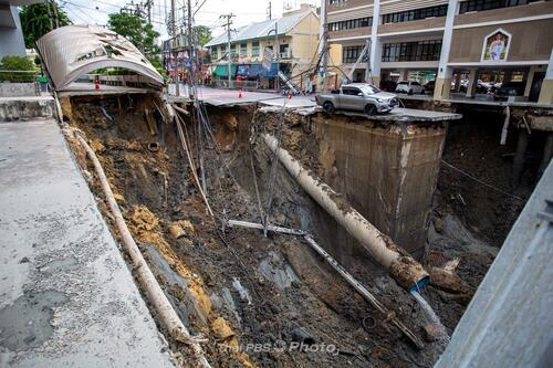 A chunk of Bangkok’s busy Samsen Road collapsed in a dramatic sinkhole on Wednesday, snapping power poles, dragging cars into the abyss, and forcing evacuations as videos of the disaster ricocheted across social media.
