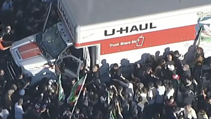 There’s reason to believe the U-Haul driver didn’t intend to hurt people: He was in a large truck and caused no casualties. No ambulances were called to the scene, and police said they’ve only confirmed that one person was hit by the truck, and wasn’t seriously injured. The Los Angeles Fire Department said the two people whom they evaluated at the site of the incident declined treatment. LA Police said they do not consider it an act of terrorism, but rather that it started with an altercation. That would seem to indicate the driver may have been using the banner-laden truck to advertise his particular views on Iran’s future, and triggered a potent response from the demonstrators that led the driver to flee in haste. He had no prior arrest record, but now faces possible charges of assault with a deadly weapon.