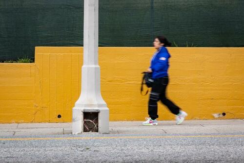 A woman walks past a street light subjected to wire theft in Los Angeles on April 4, 2024. John Fredricks/The Epoch Times