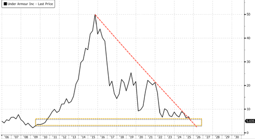 UA stock is down 34.5% year-to-date as of late Monday’s cash trading session in New York. Shares are now trading at 2010 levels, marking a collapse from the 2015 peak and extending what has become a decade-long bear market.